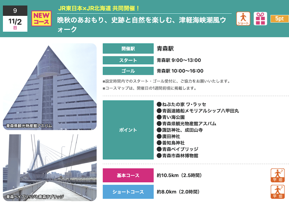 青森県青森市JR北海道ヘルシーウォーキングJR東日本駅からハイキング共同開催晩秋のあおもり、史跡と自然を楽しむ、津軽海峡潮風ウォークひなちゃんは青森駅からスタートしてショートコース8kmにします歩き慣れた青森市のスポット新しいところは全くないですけど再発見あるかもスタート!あおもりびっくりんごこのモニュメントいつもあるとは限らないねラブリッジから見る...青森ベイブリッジメモリアルシップ八甲田丸海上保安庁の巡視船ん?観光物産館アスパム裏の青い海公園ラーメンフェスの準備中帰りに寄ってみるかな?12月1日から青森県と函館観光キャンペーンですオートグラス東日本青森営業所建物が真っ赤じゃんこの時期だけのスポット太宰治の下宿地跡ふるさとの金木町から青森中学校(現在の青森高校)に進学下宿生だったね堤川を渡り諏訪神社へひなちゃんは一人でおまいりします江戸時代に堤川をさかのぼったイルカが群れでおまいりしたという伝説があるへえ?そんなイルカがいるかい?晩秋の青森ウォークここで折り返しです