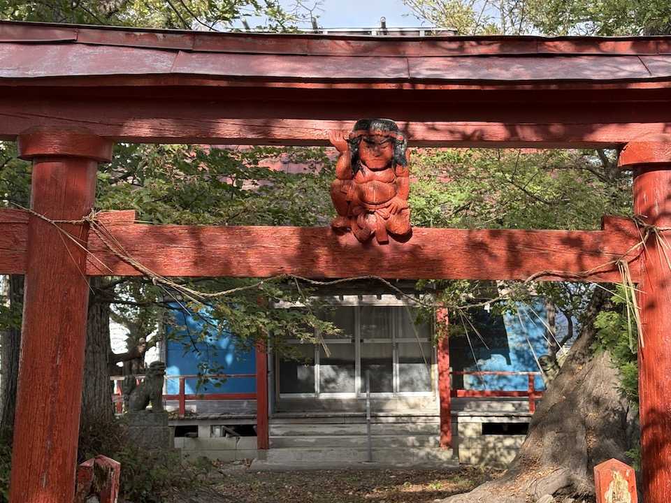 青森県中泊町お宝バスツアー五所川原市金木町蒔田金毘羅宮です赤い鳥居の真ん中に鬼がいるのこれね鬼コといって津軽の神社にはよくある鬼は悪いものではなくて災いから守ってくれる良い鬼と言われてます勇ましくもあり愛らしくもあり角があるのも角がないのも後ろ姿は?見ちゃいました鬼コカードもあるんですよ津軽には...鬼コが40ヶ所くらいあるそうです