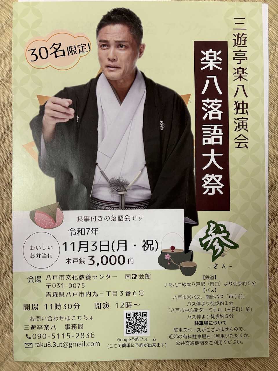 今朝は晴れ☀️4℃。最高13℃の予報です。昨日午前中はテレビを見て、お昼から落語。皆さんは落語はいかがですか?三遊亭楽八さんの落語独演会でした。1980年静岡県磐田市生まれ、45歳。三遊亭圓楽さんの門下で、二つ目。 30人ほどの食事付き小さな落語会でした。楽八と名前ですが、八戸とは関係ないようです。古典落語を、前半3つ。かっぽれ踊りを挟んで、後半1つ。2時間ほどでした。古典落語ネタで、しんみりと。とっても元気な方で、話はとても上手です。ただ、オリジナルの明るい落語も聴きたかったな。帰りに近くの菊まつりを見て、お弁当は、持ち帰って食べました。