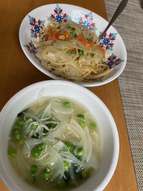 今日の昼ごはんは、先日収穫したうすいえんどうと今日収穫した玉ねぎを入れてつくってもらいました。おいしかったですよ~