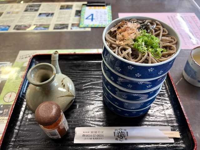 ここの蕎麦は、出雲の蕎麦なので「割子蕎麦」。丸い入れ物が三段に積み重さなっていてその入れ物に蕎麦が入っていてつゆをかけて食べます。つゆは土瓶に入っています。ちなみに、私は三段ではなく五段にしてみました!