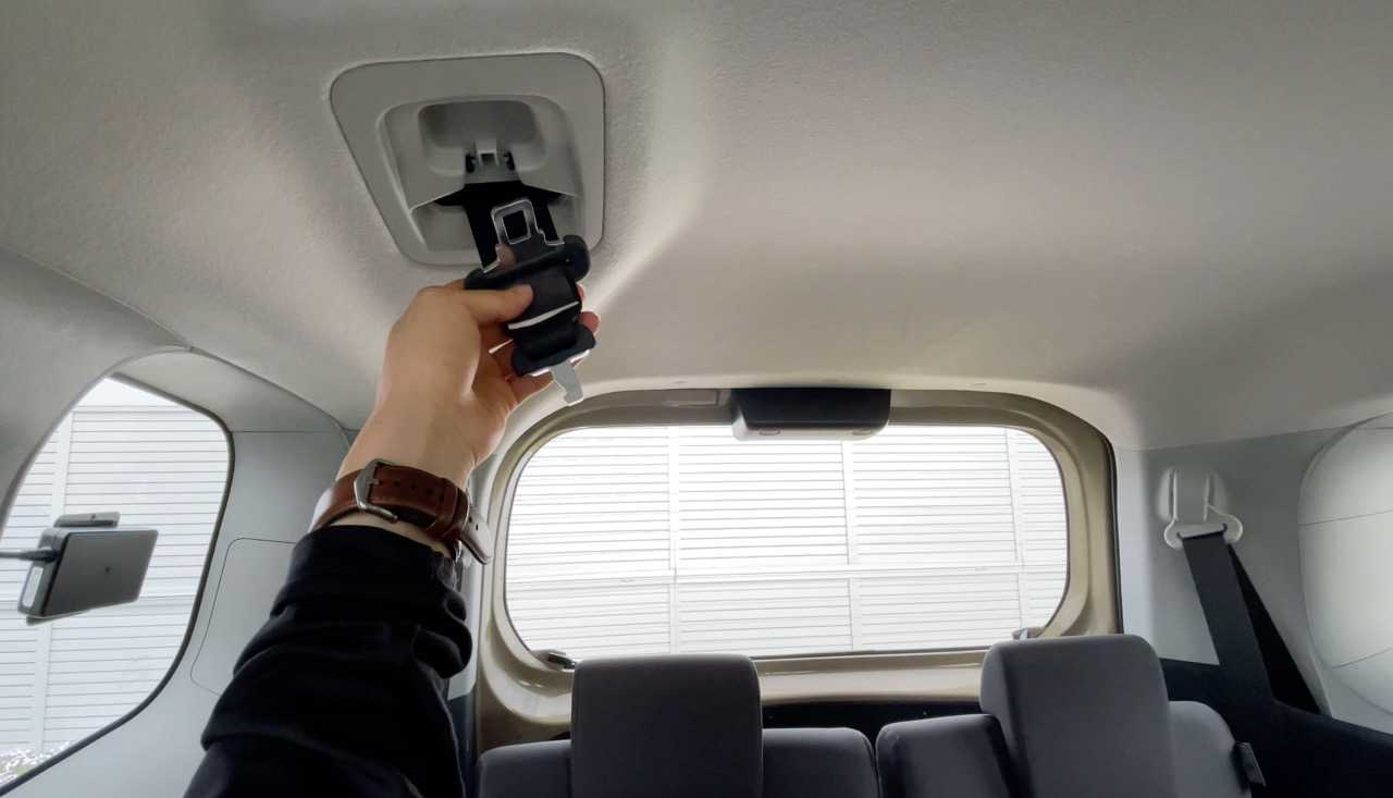 固定するとこんな感じで、天井からシートベルトを吊るした感じになります