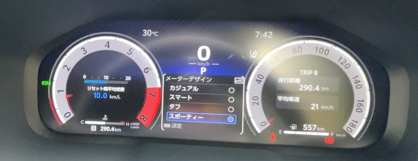ステアリングスイッチで表示内容を自由に切り替えることができ、速度計やタコメーターの配置や