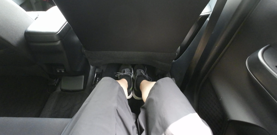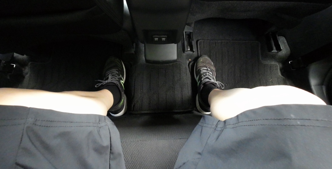 床面には前席のシートレールがあるので、足はあまり広げられないかもしれません。