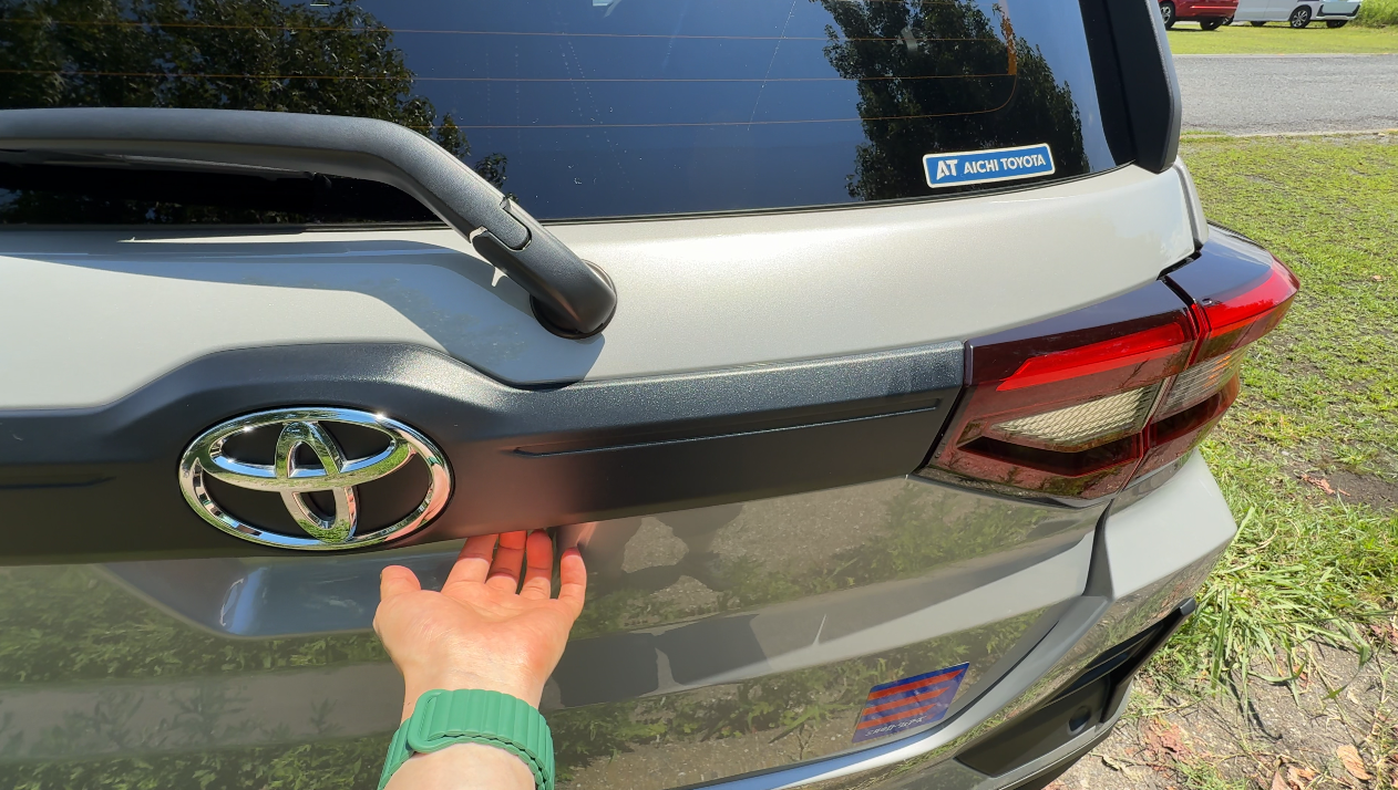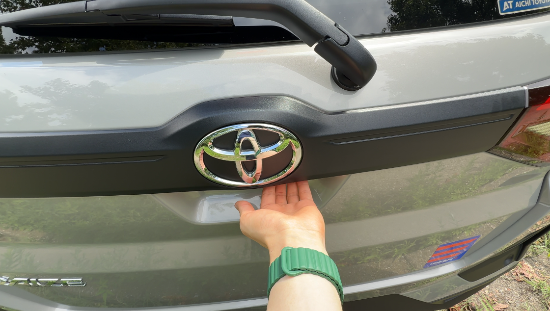 トランクを開けるスイッチは、トヨタエンブレムの少し右下に用意されています。