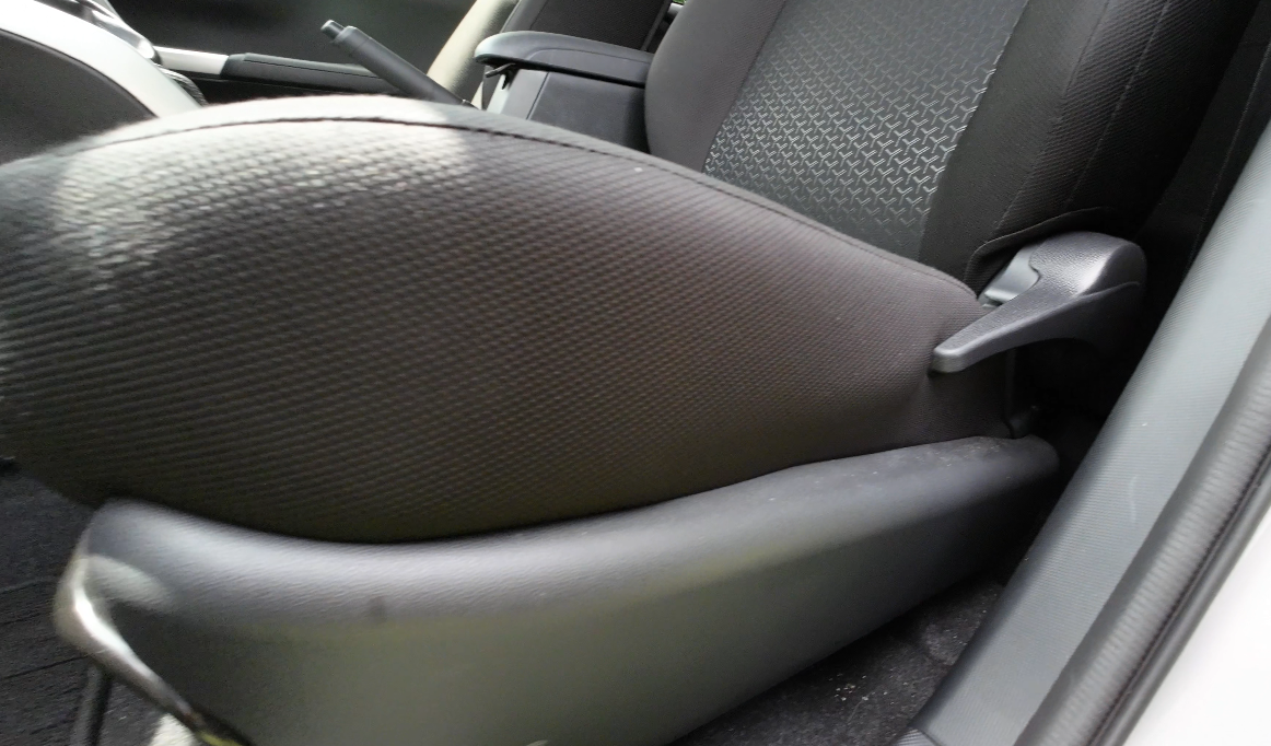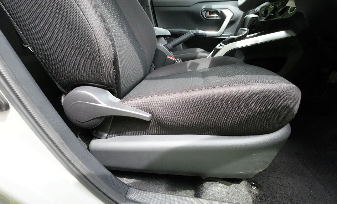 運転席のシート調節は、側面のリクライニングレバーと足元の前後調節レバーで行います。
