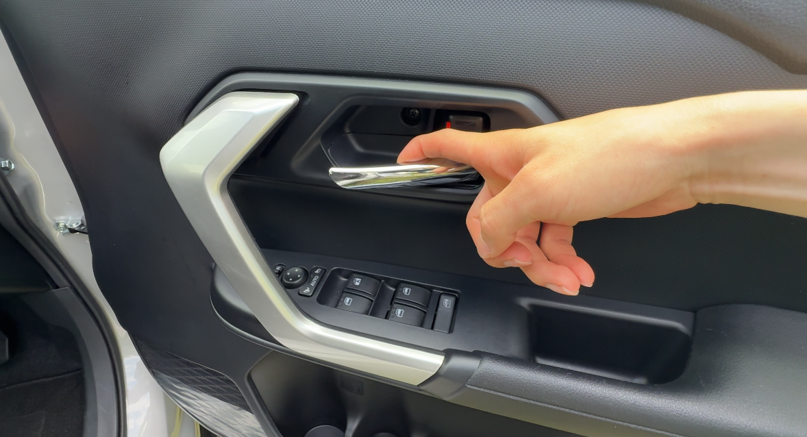 ドアレバーはメッキ仕上げで、ドアグリップは握りやすい形状(2箇所グリップあります)。