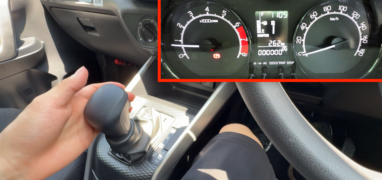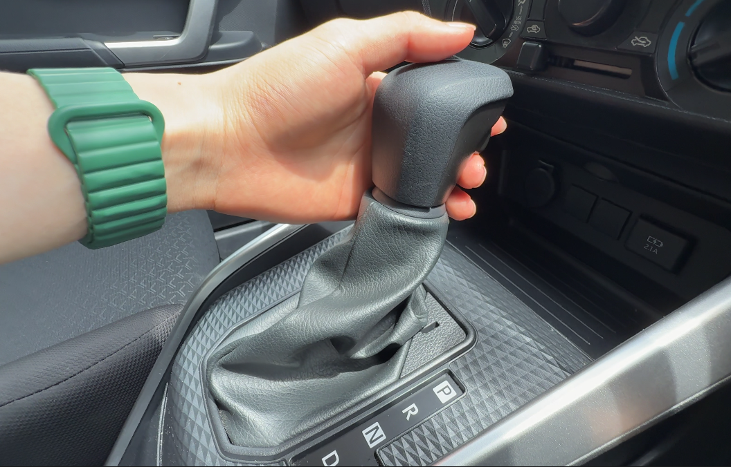 スポーツモードやマニュアルモードに倒した時は、手前側がシフトダウン、奥に倒すとシフトアップになります。