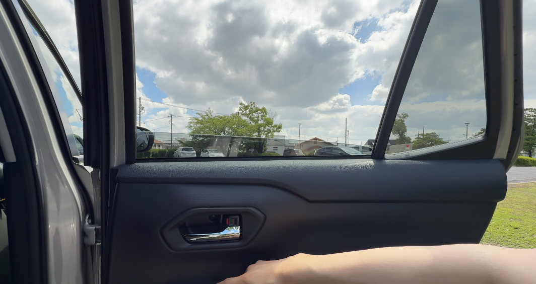 窓はマニュアル式で、9割くらいまで下がります。