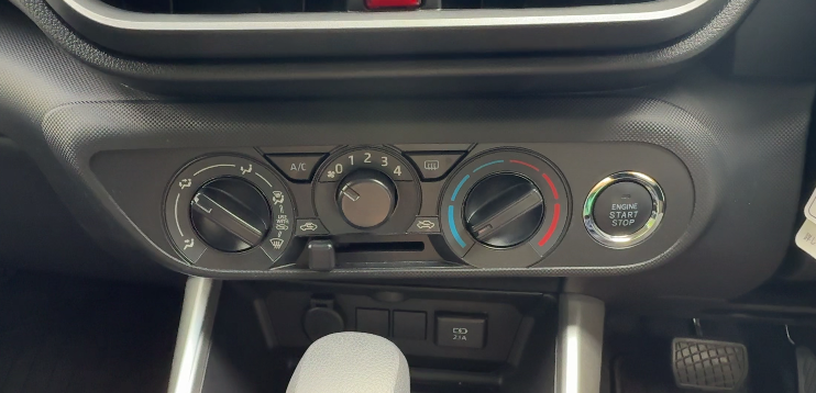 エアコンパネルはマニュアル式で、風量、風向き、温度はダイヤルで操作します。
