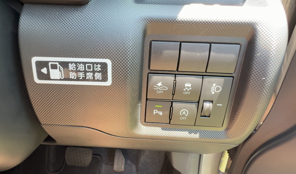 運転席右下にはアイドリングストップや安全装備のオフスイッチがあります。