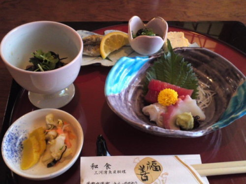 お稽古で。1時間半のために!!いいの、基本、旅は楽しむ方だから・・・何を楽しむって、食ですよね。新横浜から豊橋までひかりで1時間。そこから在来線で10分ほどでしょうか?蒲郡に到着。小学校5.6年生のころ、箏の先生に連れられて来たことがありますが、はて、全く覚えておりません。なので、すべてが新鮮。駅は高架になりたてで、きれい。駅前は基本何もあらず。すぐそばに海が見えて、風が強い。夜はさみしいかもですね。昔は、繊維産業やら、漁がさかんで、もっと栄えていたそうな。閑散とした雰囲気がちょっとさみしいところでした。お昼は、駅の近くの三河料理屋さんへ連れて行っていただきました。三河湾魚貝料理福善さんです。名物のメヒカリの素揚げをレモンをキュキュッと絞っていただいたら、香ばしいし、脂も乗っていて、とっても美味しい!ご飯は、桜?梅?ごはんで・・・メインは子持ガレイの煮つけ。甘い味付けで、奇麗にいただきました。最後のデザートはなんと、スイカでしたよ。南国だから?ミカンも有名だそうで、季節になると、沿線の畑がオレンジに染まるそうです。そんなに行く機会はないけれど・・・短い滞在を、潮風に巻かれながら楽しみました。