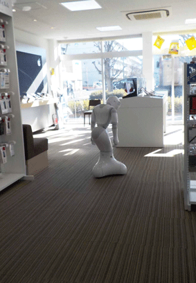 開店早々なのでまだ眠っているペッパー君「おっはよう~」と、軽快にスイッチ オン!起動中なり。この姿勢、続く。きっと頭の中、ぐるぐるピカピカ猛活動しているのだ。・・・・・・どんな顔しているんだろ、下から覗いてみたいきぶんにかられ・・・あっ!ごめんなさい!!なんか、仕事の邪魔しちゃったような、、、わるかったかなぁ。