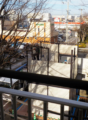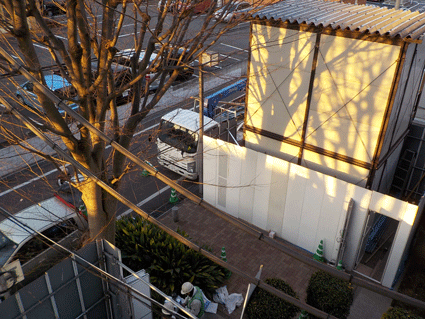 ふと見たらいつものキッチンからの眺めの中に、いつの間にかこんな光景が!ナニカをつくっています。団地の工事が始まるのでそれ関係の事務所、でしょうか?お、こうしている間にもう屋根が。テキパキ、 チャッチャと仕上がって行きますね~。