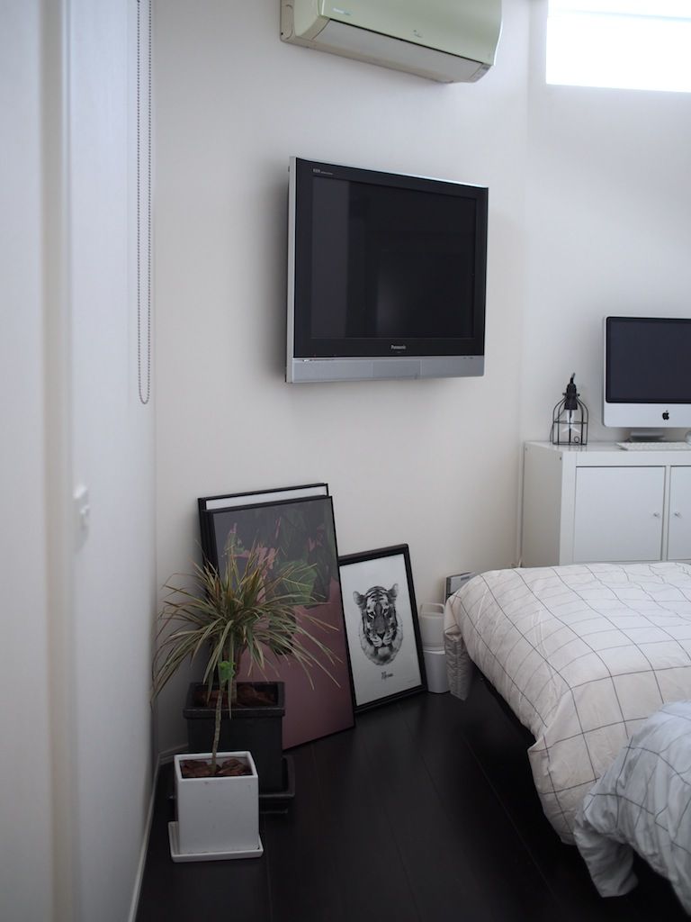 寝室の床も、子供部屋と同じ様に濃い色の合板なので、