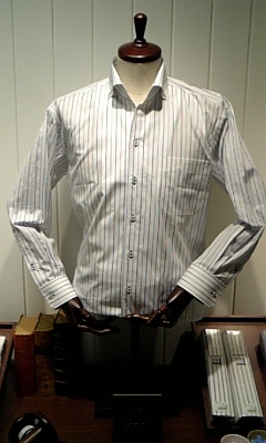 主人のワイシャツを作りに行きました。既製品ではどうもしっくりいかなくて数年前からいつも高島屋さんにお世話になっています。百貨店は今、どこもクールビズばかり仕立てシャツのコーナーにもこんなお洒落なシャツが飾ってありました。 クールビズってただ前のボタンを開けているだけだと思っていたら襟の作りがとても凝っている事に気づきました。ボタンを留める必要がないから本来第一ボタンの場所がVにカットされていてもちろんボタンもない。あっそうか。って初めて知りました。このシャツがとても涼しげなデザインだったのでクールビズ仕様にはしなかったけれど夫婦の意見が一致してこの生地で仕立ててもらうことに決めました。出来上がりが楽しみです