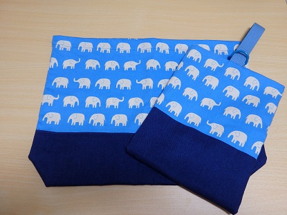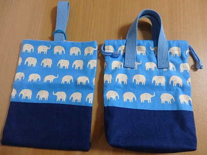 上靴入れを2種類つくりました。 ●左● Dカンを使って ●右● 持ち手と、巾着と。 底にはマチ付きこの、よく見かける「Dカン」を使ったのが最近は、主流なのかな。 入園グッズの本や、手芸店での見本に置いてある上靴入れはみなこのDカンを使ってる。(昔なら、上靴入れなんてフツーの巾着袋だったんだろーなー)こういう色もきれいそれで本の作り方どおり、作ってみて(左の)実際に上靴を入れてみると靴の重みでか、Dカンまわりの布がもたつくんです。 うーん、これでも使えるけど、どうだろう・・・。本には、普通のカバンのような持ち手の、タイプも作り方が載っていたので、気になって作ってみました。(右の)やっぱりこっちの持ち手のほうが持ちやすそう!上靴入れて、巾着になっています。もしもブンブンまわしても(するのか?)上靴が出てくることはないだろな☆息子に持たせると、分かってるのかどことなくニンマリしてる中にも、折り返しが、ぞうさん。濃いほうは、京都で買ったループエンド。 青色がとってもきれいで。 (お弁当袋に使おっと)透きとおったほうは、淡い水色に透きとおってて、キラキラ。 (上の上靴入れに使っています)この本見て作っていますいいなあと思う生地がいっぱい・・・
