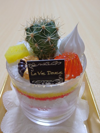 お誕生日のプレゼントイオンにいっしょに行ってて親戚が教えてくれて、子どもたちがつくっておばあちゃんのに誕生日プレゼントにしようってことになり。砂の色をすきなの3色選び、スイーツの飾りも3つ、サボテンを4種類のなかから選んで。砂を入れて、層になるように色をかえて。サボテンをまんなかに置いて、砂を上まで入れてお水をかけて砂をかためて。サボテンのまわりにスイーツを置いてできあがり♪ほかの姪っ子たちも作ってて、みな全然違う仕上がり。おもしろいね。子どもたちが楽しそうに作ってるの見て、自分もやってみたくなり、自分の部屋にもほしいなー!わたしたちもしよっか!と意気投合して、もう1セットづつ注文しちゃったのでした。こどもたちは主人たちにまかせて母親ふたりは各自熱中して、できたのはこれ満足満足♪ケースに入れてお持ち帰り。ふたつ並べてみると、息子がつくったののほうがかわいいかも左のは、おばあちゃんのもとへ。1階に飾られてます。 ・・・ケースから出されてはだかのままでおいてあるのでホコリかぶるのが心配。 (ケースはどこへ?掃除あまりしない人だからなぁ・・・)みんなで作って誰のプレゼントかわかんなくなっちゃうような、でも楽しい時間でした。
