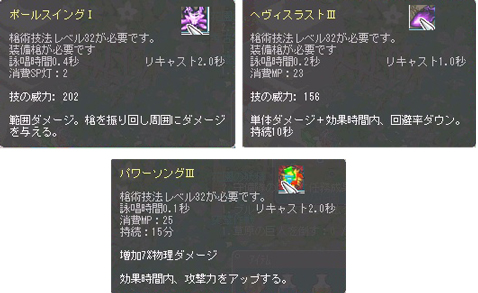 コンバンワ...φ(゚∀゚*)・。+゚ 満月です~明日、また我が家にチビッコ嵐がやってきますw(ぇ外も荒れそうだそうで。。。なんかあの子が来る日って、天気荒れるような気がする。。。w偶然なんだか、故意か?w(違wまぁまた天気も家の中の嵐も、大人しく過ぎ去ってくれる事を願うwε~( ̄、 ̄;)ゞフーさて、今日もAOですwメインちゃんは、いよいよカウントダウンに入りました!只今丁度92%!@8%で上がるぜよ~俄然やる気満々ですw頑張ってますwさて、昼間久々にサブをやってまいりましたw折角カード貰ったので、槍弓の子のLV上げを^^bカードは全部使っちゃいましたが、巨石で狩りをみっちりやったお陰でLVを34に!槍技法を1つ上げて32にLVUPさせました♪ (^_-)vブイブイッという事で、新しい技ゲット!ようやくサブでも範囲(ポールスイング)覚えたぞ~~!ヽ(*⌒∇^)ノヤッホーイ♪・・・と思って、良く説明見ずに直ぐ使ってみたら。。。2発目出ない。。。( ̄□ ̄;)で、説明書き良く確かめたら、この技MP消費じゃなく、SP消費技だった。。。というオチorzしかも2も消費するから、いまのサブだと直ぐには1発しか放てない技><;意味ない~~~~ジタバタ o(><” 三 ”><)o ドタバタ.....(;__)/| ずぅぅぅぅん猛烈に喜んで損した気分。。。今度は弓LV上げしようっと。。。(´・ω・`)ションボリ何時やるか分からんけどw(ぁただ好みとしては、槍の方が好きな満月でしたwここをお読み下さってる方々は、薄々理解してくださると思いますがねwσ(=^‥^=)の趣味キャラ傾向w( ̄0 ̄;アッいかん!明日は早いんだった!! (゚ー゚;Aアセアセ寝ます!では今日はここまで~-~)ノ~~ ジャネマタネッ|)≡サッ