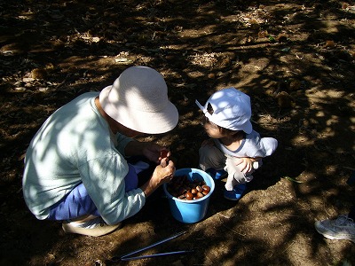 週末の三連休の日に、私の祖母の家に遊びに行ったのと、急遽親戚皆で栗拾いに出かけました。車で30分くらいいくと私の知り合いの栗園があって、以前来たときはコウキがまだお腹の中にいるときから一回も行っていなかったので、いつくるんだ?とお誘いがあったので、祖母の家に行ったときにその話をしたら、じゃあこれから行こうって話になったのです。祖母、伯父2人、母、弟、ダンナ、私、コウキと8人。コウキは、何をしているのか不思議そうにしていましたが、大勢でにぎやかに過ごしたので祖母もコウキも大喜び写真に写っているのは、今年86歳の私の祖母、コウキにとってはひいばあちゃん祖母が一番多く拾っていました。いつまでも元気でいて欲しいです