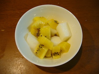 牛乳寒天とキゥイフルーツのパフェユウセイには好評だったけどコウキは一口食べて、「いらなーい」だってせっかく作ったのになぁ・・