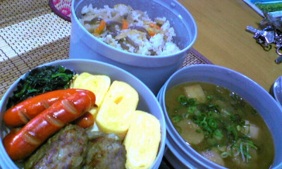 お弁当にはカキを取り除き(傷みが早いので)鶏肉などを入れ、オカズはいつもの定番メニュー(^-^;