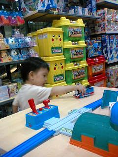 先週、チビ介は1歳6ヶ月になった。今までチビ介に6ヶ月記念、1歳記念とプレゼントをあげてきた。今日は昨晩徹夜仕事で今日の昼に帰ってきたダー介が買い物につきあってくれたので、一緒にチビ介のオモチャを探していた。実際は、探すまでもなく、チビ介がオモチャ売り場で夢中になったオモチャがあったので即決まった。それはトーマスのプラレール!ここ2ヶ月くらいでミニカーに興味を持つようになったチビ介。それがついにプラレールに夢中になるようになったのかぁ・・・と、真剣なまなざしでプラレールで遊ぶ男の子の顔したチビ介に見とれてしまった…そして、ダー介がトーマスプラレールの箱を持ってきた。すると、チビ介、ずっと放さなかったトーマスを放して「その箱ちょうだい!」と手を出してきた。中身わかったか?(笑)必死に抱え込んでいる姿がおかしい。今日はチビ介のトーマスプラレールにじんわり私まで幸せな気分♪ところで、先日コメントで「あきあきさんってしょうこお姉さんに似てる」というCOCOママさんのご指摘があった。そこでしょうこお姉さんをネットで検索!でも画像が少ないので、仕方なく(笑)「おかあさんといっしょ」を見た。今のキャストになって初めて見た…。今はもうじゃじゃまるたち出てないのね!びっくり。「さよならマーチ」で終わらないのね!びっくりびっくり。で、しょうこお姉さん問題。えっとですね、しょうこお姉さんの方がキリっとした顔してます、美人です。私は…良く言えば「たれぱんだ」、悪く言えば「ガチャピン」。(ガチャピンごめん、ゆるせ!)アライグマ系です。たれ目。この間ビデオに写った自分の顔見てびっくりした。スゴイたれ目。でも歌のお姉さんと言えば、大学卒業後就職した学習塾の上司に、退職願いを出して面接した時「あきあきさんは、歌のお姉さんか旅館のおかみが向いてると思います」と言われた…。お姉さんとおかみって違うよね(笑)この上司は事あるごとに「あきあきさんの歌のお姉さんの様な新しい風を塾に吹き込んでください」とか言ってた。でもね、私、あそこまで爽やかじゃないんだよね…。別の上司には退職時、「まるで寅さんだな」と言われた。意味わからない…。アリーもしょうこお姉さんもおかみも寅さんも全然ちがーう!そうそう、「あきあきさんって吉田拓郎の奥さんに似てる」と言われたことある・・・(笑)「何番目?それ重要!」と聞いたら、浅田美代子ではなかった。一番目の奥さんでもない。ふぅ。それより、今のチビ介の前髪が吉田拓郎ヘアです(笑)昨日、まさよんにも「あ、それだ、まさにそれだ!」と言われた。とにかくしょうこお姉さんのように美しくありません、あしからず…。
