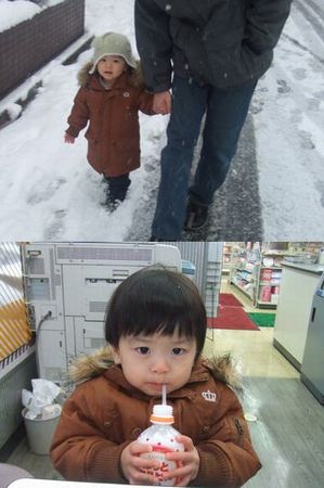 まず最初に言っておくけど、回転寿司初体験はチビ介。私ではない。お寿司はカウンターのお店だけしか・・・なんて言わないから(笑)。私は一人で回転寿司に行ったことあるくらいだからね。しかも、回ってるのには手を出さずに、「イカお願いします!」とか1人でも声をあげてオーダーし、もくもくと食べたことがある女です。さて、本題。昨日は東京も大雪。だけど、先日しんちゃんママから近所に回転寿司がオープンしたと聞き、いざ回転寿司へ!場所は軽くしか聞いてなかったし雪だったけれど、行くとなったら行くのだ。聞いたとおりの街道を歩いているはずだけれどなかなか回転寿司が見当たらない。うーん。曲がる交差点、間違えたか?不安になりコンビニに入り、聞いてみた。大丈夫。間違ってない。でも、コンビニから更に5分くらい歩くと聞き、休憩。ミニストップなので飲食する場所があった。チビ介のこの固い表情に注目。そしてまた歩いて、回転寿司へ到着。回転寿司はチビ介にとってはとても楽しかったみたい。とってもはしゃいでいた。私も回転寿司は久しぶりだけれどなかなか楽しかった。一番美味しかったのはカニ汁かな。やはり雪道は寒かったからねー。帰りはパン屋さんに寄った。このパン屋さんは地元の人気店。子どもが遊べるスペースがある。いつもはあまりここで遊ばないチビ介だけれど、昨日はやけにエンジョイしていた。なかなか帰りたがらなかった。やはり雪道は寒かったのだね、チビ介にも。(笑)でも、雪の中親子三人で歩いて回転寿司に行くというのはなかなか楽しい時間だった。雪が降ると、やはりどこか興奮してしまうのだろうね。それに、街がキレイに見える。街道の樹木も雪化粧されている。「あれー。こんなに樹があったんだねー」と再発見。ところで昨日は受験生はセンター試験の日。あんな大雪で大変だっただろうなぁ。今年の大学受験生は、私が塾に勤めていた時の小学6年生。今でも連絡をとっているのは1人だけで、その子は推薦で短大に合格が決まっているからセンター試験は受けない。でも、ほかの子達は何人か受けたと思う。あの子達はまさか私が思い出してるとは夢にも思わないだろうけど、そして私のことは忘れているのだろうけど、やはり顔を思い浮かべてしまう。小学生の顔のままでね。「お祈りしてねー!」と言っていた顔を。もう頼られてもないし、お願いもされてないけど、祈っておいたよ。頑張れ受験生!