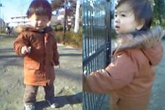 今日もとりあえず早起き出来た。就寝時間は相変わらず遅いので私は眠い。でも、『おかあさんと一緒』の『ぱわわっぷ体操』のおかげでこちらは目がさめる。あれを踊らされたらそりゃ起きる。上の写真は『ぱわわっぷ」を踊るチビ介。一番右は子どもたちがダッシュするところで、自分もダッシュしてるチビ介。すごい本気で踊るから笑える。(あー、部屋、散らかってるでしょ。チビ介が色々転がすからね。)ところで今日の『おかあさんと一緒』、体操のよしひさお兄さんとまゆお姉さんがいつもよりたくさんカメラに映っていた。「望遠鏡でのぞいてみよう」もいつもはしょうこお姉さんとゆうぞうお姉さんなのに今日はまゆお姉さんとよしひさお兄さんがやった。そろそろ二人を前へ出すのかなぁ?私はこの番組を見初めて日が浅いからよくわからないけれど、こういうことは前にもあったのかな?ところで、私はゆうぞうお兄さんが好きではない。なんか気が弱そうに見えて、実は亭主関白的なところがある気がする。(私の勝手な感想だからファンの人ごめんなさい。)なんとなく、言葉の間合いの取り方で、この人、実は人の話聞いてないな、って思うことない?あいづちのうちかたが。だから、エンディングで、「いくぜー!」ってゆうぞうが言う時ゆうぞうに仕切られるのが悔しくてならない私。だから、今日、チビ介が「いくぜー!」って言ったのですごく嬉しかった。上手に言えないのだけれど、明らかにあれは「いくぜー!」の真似。チビ介が言うと「いくよー!ついてくぜ!」って気持ちになる。これはおまけなんだけど、雑誌で、お正月特集でお母さんと一緒メンバーの直筆年賀状というのがあった。そこに、ゆうぞうは、筆記体の英語でメッセージを入れていた。サインもスター気取り風。それを見て、「ほらほら、思ったとおりだ!」とつぶやいた私。そういう人なのよ。ちなみにメッセージは To you with a lot of kiss.キッスですかぁ・・・。さて、ゆうぞうの悪口はこのくらいにして。ごめんなさい、ゆうぞうお兄さんファン。私、こんなに嫌ってるくせに会って話すことがあったら(ないと思うけど)「実は優しいお兄さんだったよ。まばたきは多かったけれど、優しくて謙虚だったよ」とか言うかもしれないから、私の言うことは気にしないように。今日も私たち親子は元気に公園に行った。寒かった。風が強かった~。チビ介はエンジョイしていた。でも多分チビ介も寒かったのだと思う。一番右の写真なんてどう見ても寒くて避難してる様子。あっ。今日は24日。チビ介の月誕生日だっ!うっかりゆうぞうお兄さんのことなんか書いちゃった。今日で1歳11ヶ月のチビ介。あ、でも成長の証。踊る様子も日記に書かれてるし、「いくぜ!」って言ったっていうのも成長の記録だよね。(←明らかに焦っている)