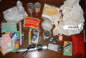 ・水運搬バッグ・水(ペット)・乾パン・クッキー・軍手・タオル・ろうそく・マッチ・固形燃料・レジャーシート・アルミブランケット・サバイバルカード(アウトドアツール)・携帯ラジオ・救急セット(ばんそうこうなど)・ティッシュ・防塵マスク・サイリューム・ホイッスル・ロープ・懐中電灯・ポリ袋