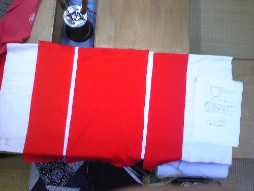 和裁教室で。昨年から、作ってみたいと思ってテキストを先生から貰っていた還暦頭巾を作ってみました。大黒頭巾と言うそうです。本来は、正絹で作るものなのですが、とりあえず試作という事で 赤い新モス 白い新モス で。まずは、必要な丈(今回は54センチ)を2枚切り、一枚を巾半分にして両側に接ぎます。一番大きく切れる円に切り落とし。あわせて、仮とじして 八等分に印をつけて 頭の周りの長さに合わせてタックをとり、ヘリ布? をつけて終了。ヘリ布の中に、綿も入れてみました。本体に綿を入れても良いようです。