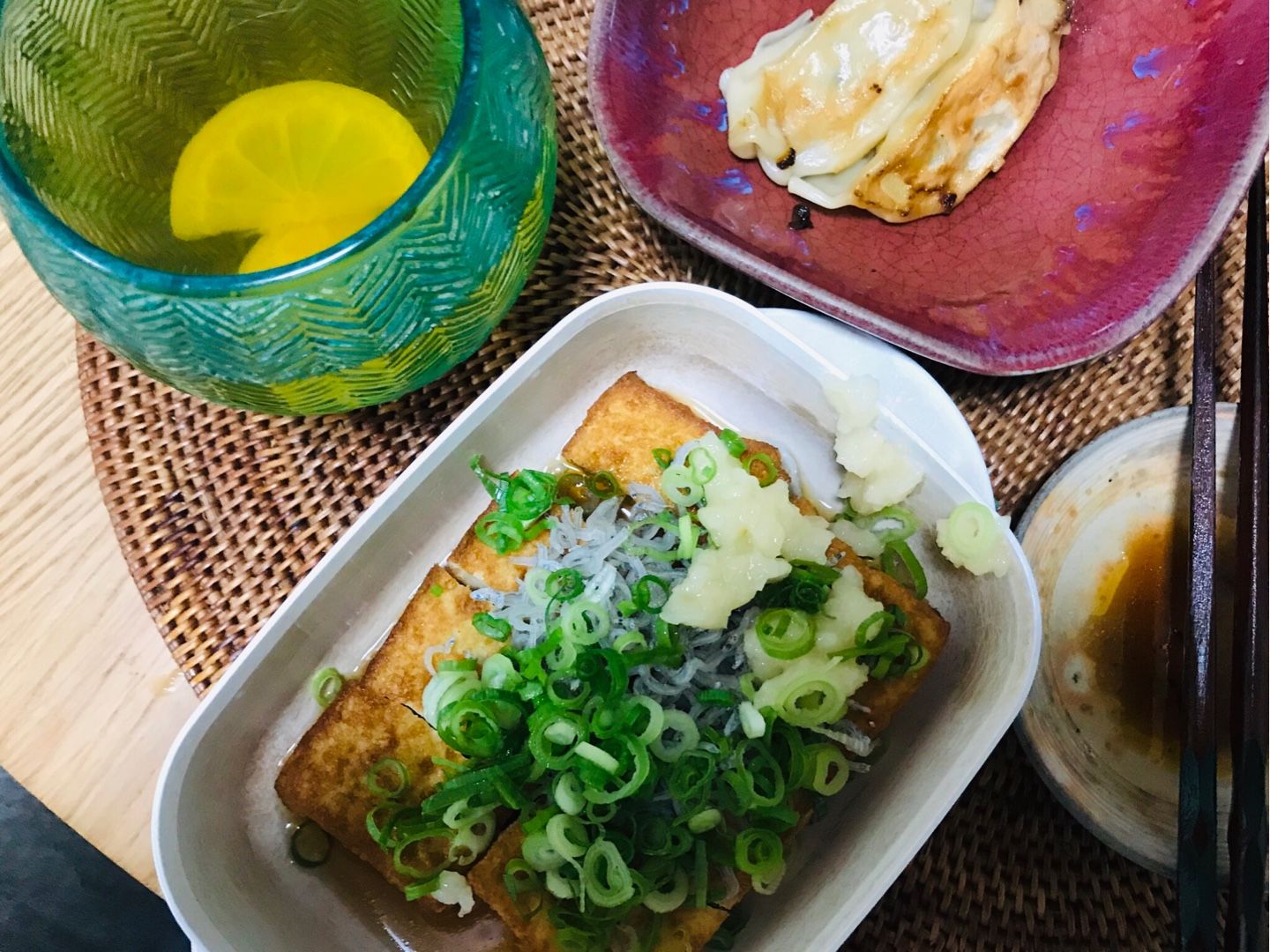 しらすと細ねぎとニンニクをトッピングした絹揚げ豆腐を肴に