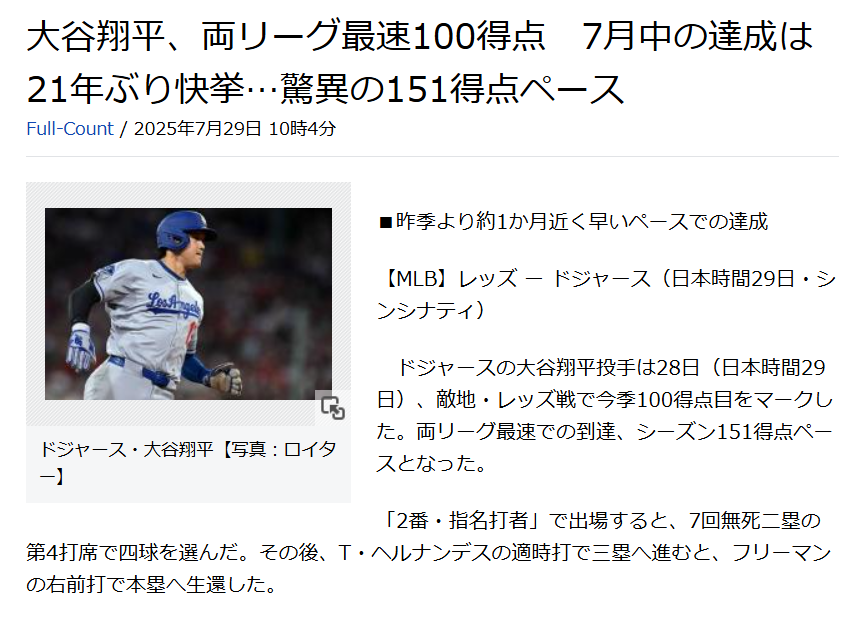 大谷翔平選手 両リーグ最速100得点