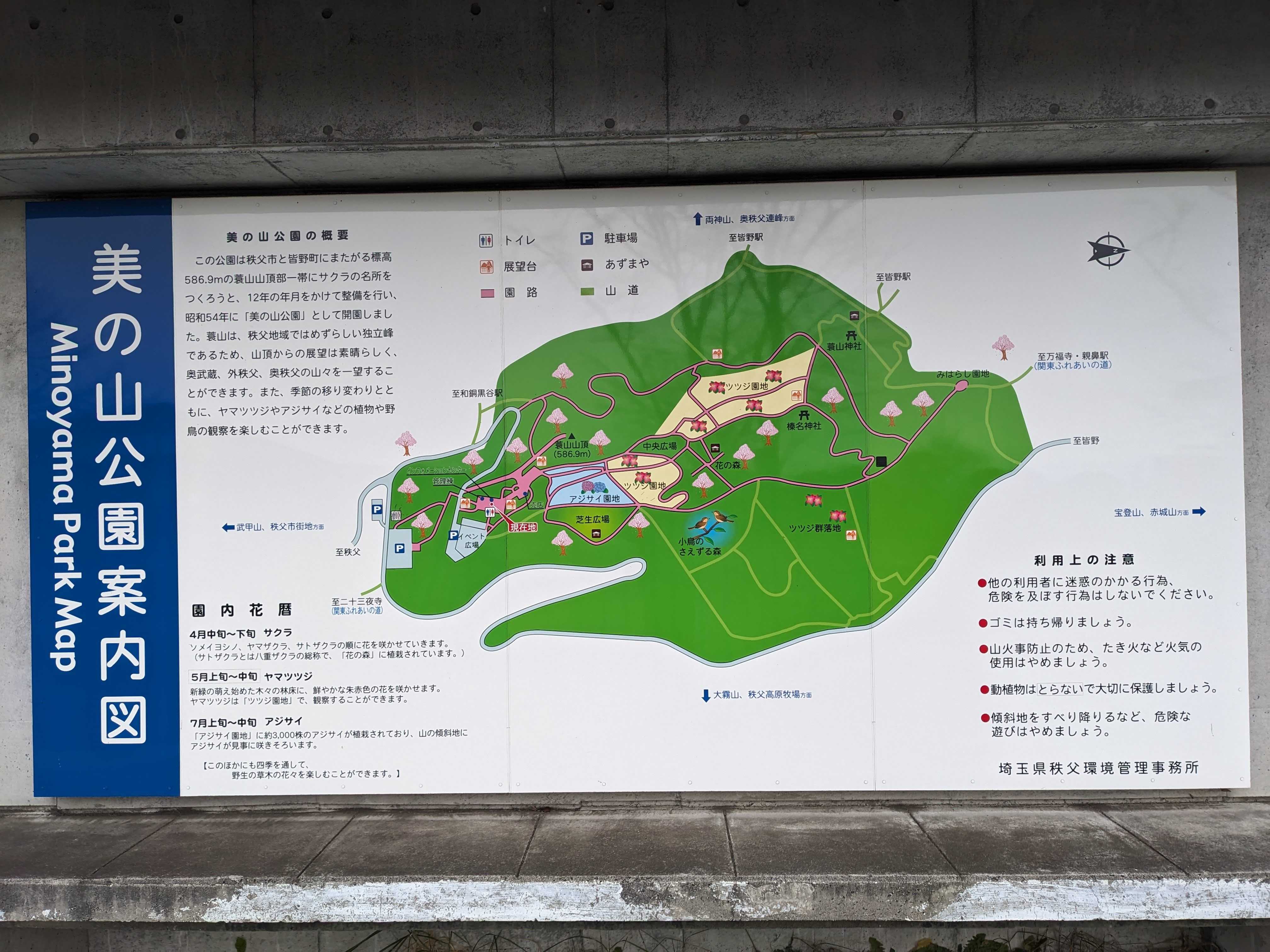 美の山公園は、自然豊かな秩父の丘陵に位置する公園で、四季折々の景色が楽しめます。駐車場は無料で、広めのスペースがあり普通車でも止めやすく便利です。公園名の由来は「美しい山々の景色を楽しむ場所」という意味から名付けられたそうです。春は桜、夏は新緑、秋は紅葉、冬は雪景色と、季節ごとに見どころが変わる様です。※季節ごとに何度訪れても楽しめそうですね展望台からは秩父の山々が一望でき、眺めはとても爽快です。また遊歩道や広場も整備されており、麓から登る事も良いかもしれません。