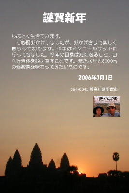 2006年明けましておめでとうございます。 西新井大師へ6時の朝1番のお護摩に行ってきた。昨年も無事に過ごせたことを感謝し、来年もおまいりが出来るようにお願いしたきた。1年は早い。特に1年に1度しかないイベントはなおさらだ。今年も無事に過ごせたらいいと思った。普段から幸せいっぱいなので、意地汚くお願いする事がなくなった。30分の正座もしびれず、寒くもなく気分が引き締まった。 おせちと雑煮、そしてあんこ餅。お屠蘇に口をつけた。こんなに気持ちの浮つかない正月は高校受験依頼だなと感じている。受験生や論文の追い込みの人は、正月なんて心の底から祝えないな・・・。締め切りは1月27日16時、よっぽどがんばってやらないと間に合わないだろう。本当にやばい。身体壊さないようにやっているんだけど、私が言うと説得力なし。 今年は社会復帰の最終ステップ、仕事への復帰がある。学生として過ごさせてもらって家族には感謝しきれないほど協力してもらった。恩返しなど期待されていないが、迷惑をかけないようにしなければと思った。・・・と言いつつ2泊3日ぐらいの縦走と海に潜りたいと考えている。遊ぶ事しか考えてないようで恥ずかしいが、無理しない程度に楽しもうとたくらんでいる。今年の年賀状には、ご馳走して下さいと書き足した。みなさま今年もよろしくお願いいたします。ご無沙汰していて連絡取りたい方へ左のサブメニューのメール,メッセージを送るで連絡がつきますのでよろしくお願いします。