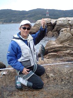 この磯は50メートル程先に立瀬と言う磯があり水道では無数の沈みが点在し、上げ下げ共に激流が流れる地磯である。今日は天下島の方向へ下る下げ潮狙いでしたが想像以上に激流!しかしその激流でマキエを撒くと足元、本流関係無く赤い絨毯状態(>_<)潮は速いし釣り座を本流の当たらない所へ。しかしここも水道へ向かう引かれ潮で手前に当てて来る(>_<)仕方なく水道の左脇に!すると流れが緩み釣りやすくなったな~て思っていると小型ながらクロちゃん!居るんだな~と思いながら釣っていると一瞬でウキが消え合わせようとするとそのまま竿引き!これはデカイ!しかし手前で寄せてきたところで這い根に突っ込まれまさかのラインブレイク(>_<)あまりのパワーにのされました。それを見ていた竹村さんがなぜ自分には当たりが無いのかと俺の釣りを後ろでじ~っと見物、なんだか緊張しながらも流し方、ラインの張り、マキエワークを実演。するとその直後竹村さんの竿が曲がってる~上がってきたのは30センチ程のクロ!いや~良かった(^-^)その後納竿しましたが竹村さんが今日も自分にとって大きな収穫があったと貴重な一枚に満足してく