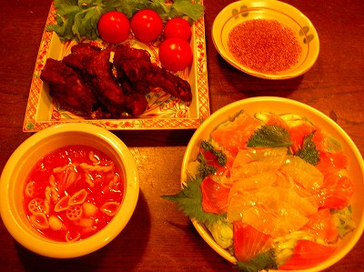 香粉排骨、真鯛とサーモンのカルパッチョ、ミネストローネスープ、