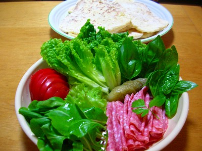 グリーンリーフレタス、ルッコラ、バジル、トマト、ピクルス、ビアソー