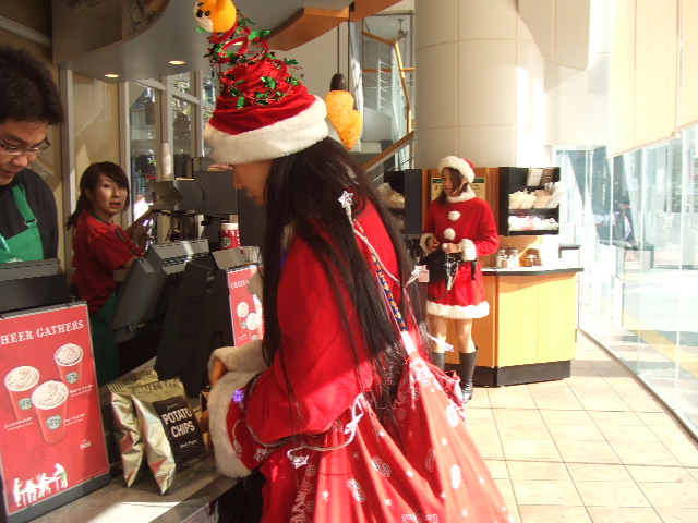HOHoHO! 昨日は待ちに待ったサンターキー。 サンターキーとは、一年の悪行の限りを償うべく、笑 サンタのカッコをして街中の子供達にお菓子を配って歩くイベントじゃよ。 (中には呑んだくれサンタもおるが) とにかく楽しいので、日記を読んでおくれ。 AM10:50 サンタは起きた時からサンタじゃよ。 家からサンタのカッコで出てきた3人娘(雪雀サンタ・おしゃまんべサンタ・こやじ)は吉祥寺で待ち合わせ、いざ渋谷へ。 AM11:30 まずはプレイベントとして、TUTAYAのスタバで朝飯しつつ、 ぞくぞく集まるサンタを観察。 今年は ぽかぽか暖かくて晴れでサンターキー日和。 日当たり良すぎて防寒サンタにはちょぃ暑かった。 AM12:00 いい加減暑いので、そろそろ仲間を求めてハチ公に移動 移動中、大画面をサンタで埋め尽くしてみる。 見にくいけど、ココでかなりテンション上がり↑ました。 到着すると、もうけっこーな数のサンタが集まっていて、サンタ達はもう呑んでいる。。。。 サンタはインターナショナル。 色んな国のサンタが集結し、写真撮影大会。 朝早いため、コギャル(もういないか?)には会えなかったものの、キャッチのギャル男にはナンパされた。(主に雪雀サンタが) とりあえずサンタ同士知らない人とは自己紹介。 1年ぶりに会うサンタ達は、久々の再会にキャーキャー。 写真撮影は、カメラを向ければどんどんサンタが集まり、集合写真状態。 カメラを見つけたらダッシュで映りにいくのだ。 ↑右端が空いてますが、ココにこやじは入ろうと走っていってUの字に転んだ。 街行く人の写メにも、快く答えるサンタたち。 パンダもいた。 事前に盛り上がっていた電車は、あまり皆の興味を引かず。 一応中から撮影。 気が付けばどんどんサンタは増え、 ハチ公にもサンタになってもらう。 _へ_____ |あちゃー。なんだこの若い者。。。 まぁそんなわけで 完成! みんなで記念撮影も。 ハチもこんな人気者になるのは、1年に一回ぐらいだろう。 PM13:00 さてさて、ひとしきり遊んだところで、サンタはドンキに買い物に行く。 子供達に配るお菓子を買わなくちゃね。 「サンタの皆さんー。。。。そろそろ。移動。するぞぉーー」 まがりサンのローワントーンな声がたまりません。