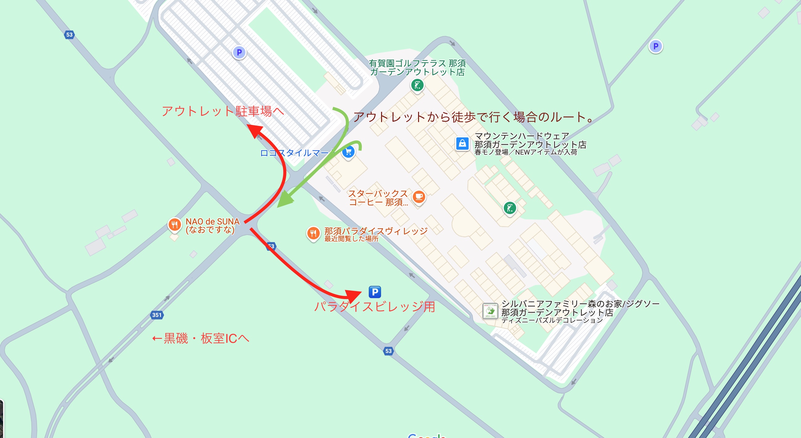 ここを直進すればアウトレットの駐車場へ。右に曲がるとすぐにパラダイスビレッジの駐車場があります。