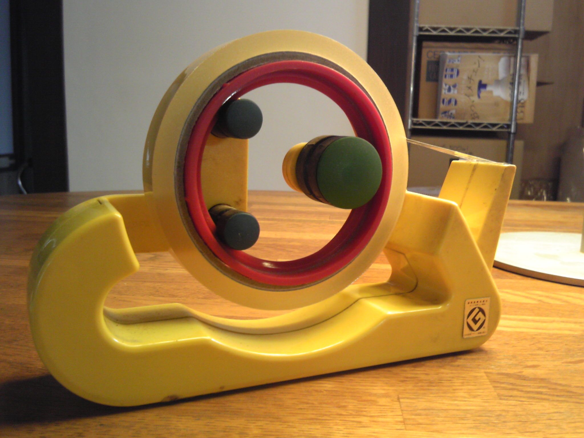 セロテープホルダー。グッドデザイン賞受賞してる。いかにも。かたや、(ただの、って無料じゃないけど)セロテープホルダー。片付け作業で発掘したのは上。使っていなかったからだ。なぜか。使いにくいからだ。テーブルの上に居るのは許せるが、。。テープを引き、カット、という作業するには、軽いのである。これは致命的である。悩ましいが、一応、テープはセットした。(笑)