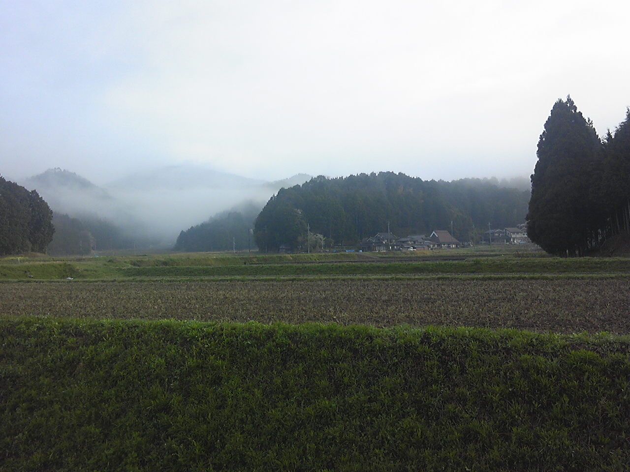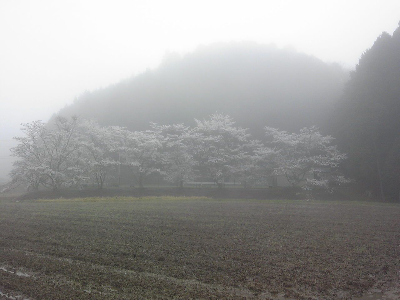 今朝は冷えて、霧が濃い。すでに日が照り出して、快晴のきざし。結構。まだ、太陽の光が無い時の桜。見上げている。