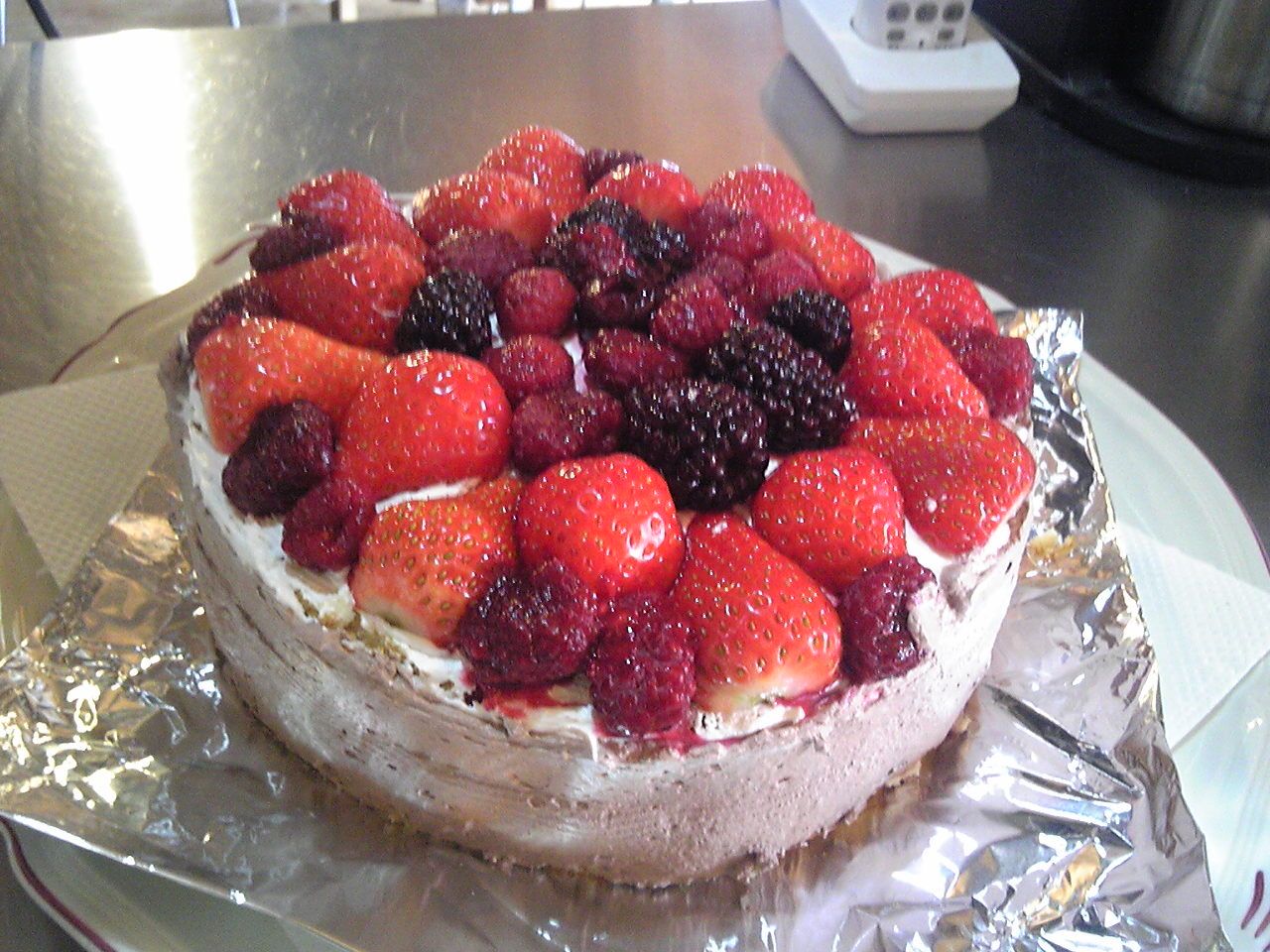 昨夜お電話貰って、お訪ねします。と、こさんご夫妻。改築後初めて。工務店の紹介からいろいろお世話になった。ココは一つ、がんばろー、というわけで、。ケーキ作成。昼はお弁当を買った。買うと高いので、(笑)、思いっきり食べましょう!と、ホールをテーブルに。。6分の一づつ、おやつに食べた。しばらく、甘いものは、遠ざけなくては・・。(笑)果物は砂糖を加えたりしていないので意外とあっさりしてた。
