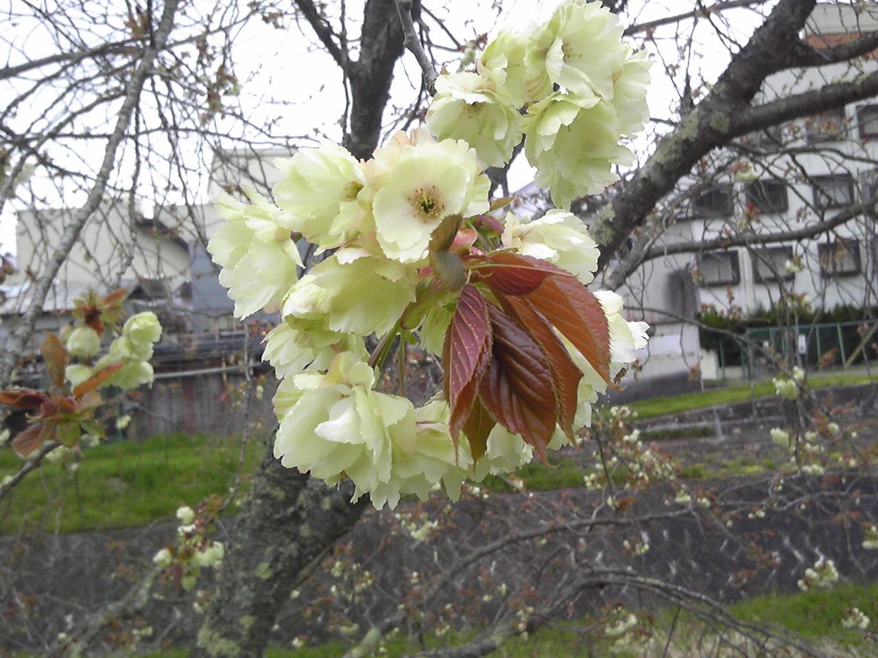 右側が老木。左側が新入生。池尻さん(神社)の桜。新入生の内、1本が、葉が先に出ている・・。はて?家の前の用水池の周りに植えられている大木。すべて、咲く途上なので、風にも散らず、今朝はまた冷えているので今年は長持ちしそう・・。犬と散歩してお花見。