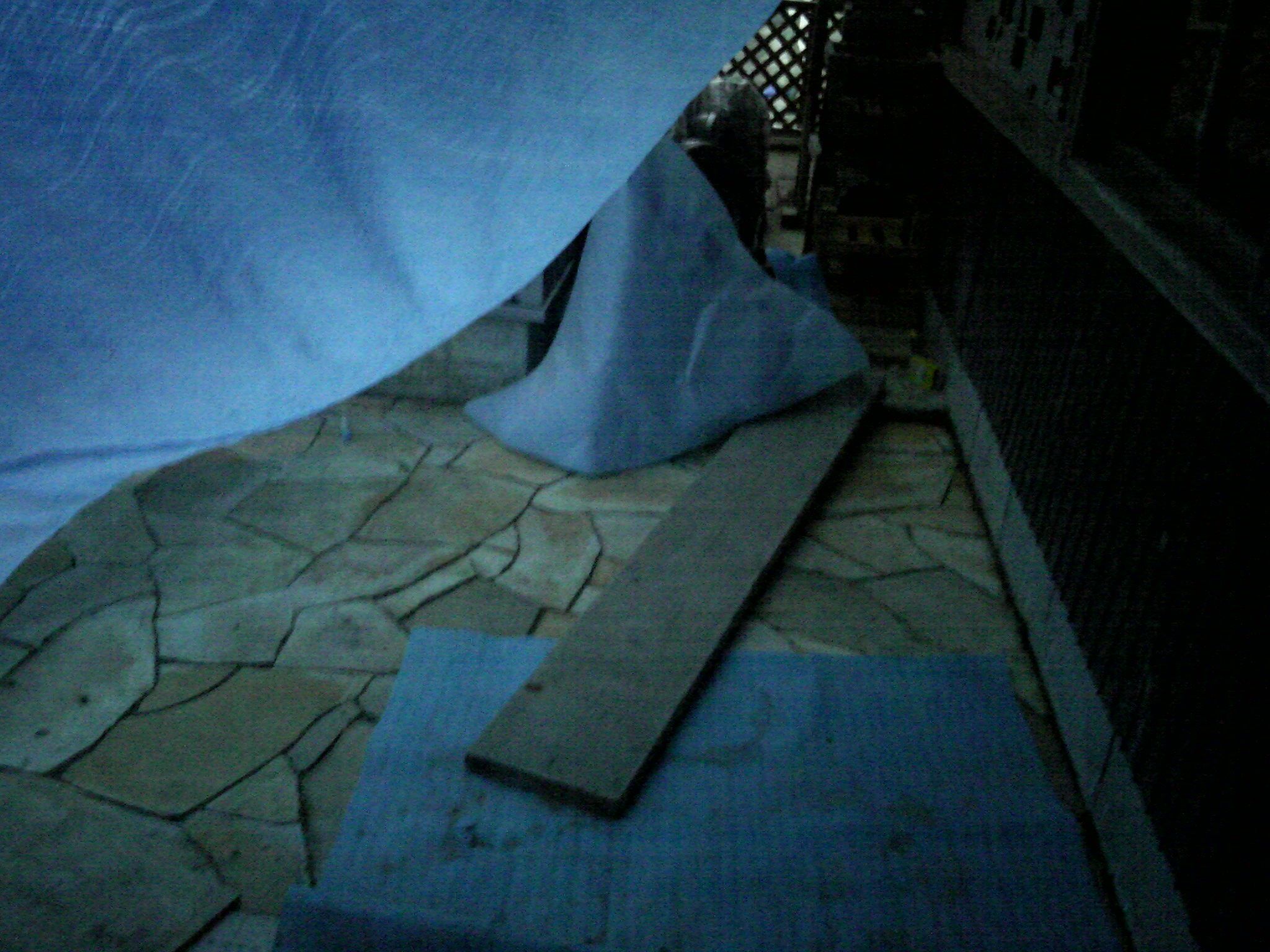 写真右上方の格子戸手前までの石貼り完了で、明日は目地で、この部分終了予定。おつかれさまです。