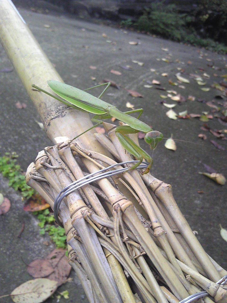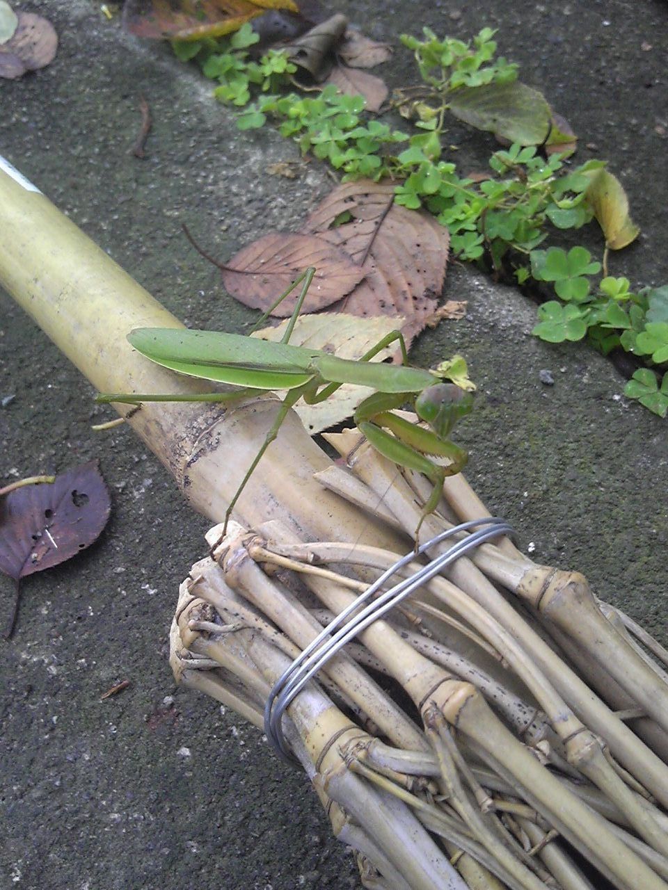 カマキリが、箒に居たので、外の道の落ち葉の掃除に連れ出した。