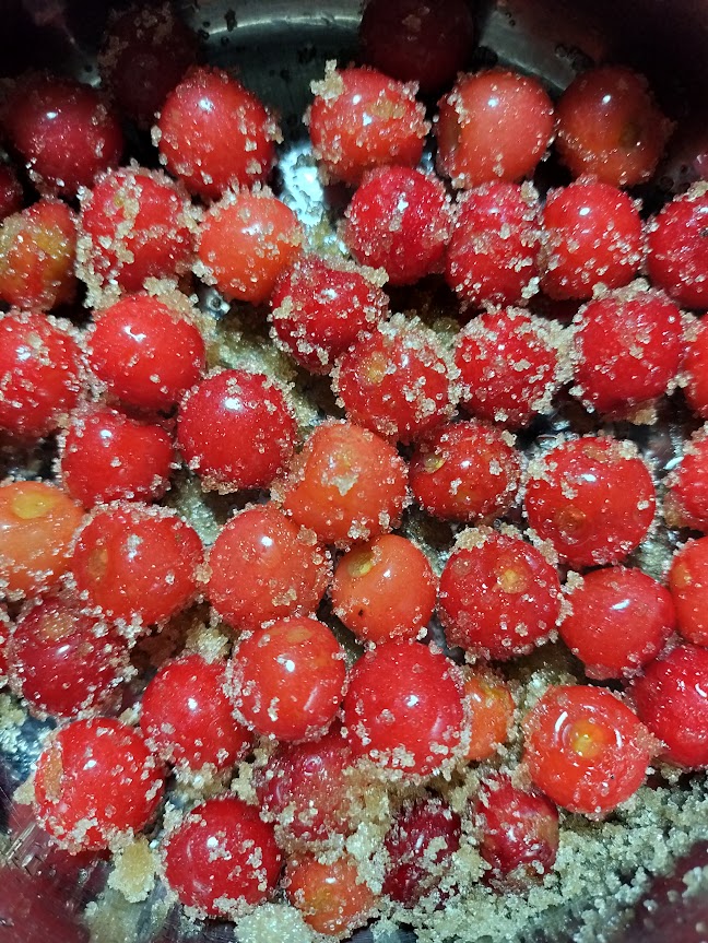 実ったサクランボ、(枝を活けていた)ジャムにするべく、砂糖でまぶす。