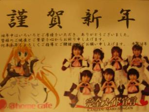 会社に行ったら、○ンケイ○ロモーション○ドバンスという会社から年賀状が届いていた。何十枚もあるお仕事、取り引き系の年賀状の中で、なんとその賀状のみは、裏にメイドさんたちの写真つき。とても目立って少々うれし?恥ずかしかった・・・・が、誰からだろうと思ってよくみてみると、ドンキホーテ秋葉原店5F(外神田4-3-3)にある、メイド喫茶?、「@ほぉ~むcafe」の運営会社からではないか。ここの会社の女性社長さん(通称MIHAさん?)は、Tyeesと、なぜか知り合いなのである。今では、MIHAさんは、上記店舗経営の他、プロダクション業務など色々な事業もされているようであり、女性起業家としても有名、大活躍中とのことである。さらなる、ご発展を祈りたい。--ところで、上記の@home cafeであるが、一度だけ、どんなお店か見にいったことがある。しかし、入り口のメイドさんのキャッキャッしたあまりに明るい感覚に、Tyeesおじさんとしては、はいることは勿論、入り口の半径5m以内には、近付けない状況だった。やはり、秋葉ルックかなんか、せめて、リュックくらいもっていないと、はいりにくい感じである。店内は満員のようであったが、あちこちのサイトやブログでも紹介されているので、これ以上述べる必要もあるまい。「電車男」(テレビ版かな)でも、メイド姿のウエートレスさんが男性客に「ご主人様」と呼びかける、シーンがあったかと思うが、この頃は、メイド関連を売りにしたお店が、秋葉原以外でも、とても増えているようだ。ところで、上記の@home cafeでは、女性客には、「お帰りなさいませ、お嬢様」というらしい。お嬢様と呼ばれる気分はいかなるものか。入り口に近付くこともできなかった、Tyeesおじさんとしては、御主人様とか旦那様などと呼ばれると、ちと、価値観も変わりそうな気がする。秋葉原にあるこのメイドカフェ「@home cafe」を訪れた方には、是非感想を伺いたいものである。秋葉原は、ご承知の通り、電気街で有名であり、なおかつ、組み立て式パソコンや家電のマニアックな店も、今でも健在。そして、アニメやフィギュア、ゲーム好きが多く集まる「オタクの街」としても有名になった、秋葉原。秋葉原は、様変わりしつつあり、新しいビルも増えた。駅前などは、昔のイメージからはかなり変わっている。筑波エクスプレスも秋葉原までのりいれており、筑波まで45分でいくという。秋葉発祥の流行は、「アキバ系」「萌え系」などと呼ばれ、「3000億円市場に成長」とか「すでに数兆円規模に達しているはず」と予測するアナリストもいるらしい。皆様、東京にこられたら、たまには、秋葉原にもたちより、ドンキホーテ秋葉原店5Fの「@ほぉ~むcafe」の入り口でも覘いてみてはいかが。お店にはいれるかどうかで、自分の価値観あるいは「萌え度」を試せるかもしれません。。。ところで、電車男で、よくでてくる、頭を下げている、うなだれている人を表す_| ̄|○であるが、首がころげているバージョンがあるそうですね。即ち、_| ̄|...○とか。愛娘から以前教えてもらった、orz、OTZ、OTLもこの類い。この界隈でもorzを使う方は増えたみたい。笑電車男用語なのか、2チャンネル用語なのか、おじさんTyeesには、さっぱりわからないが、このようなことを多少知っていると、娘や若い世代との会話も、多少は弾む。とりあえず自分のことはさておき、電車男の話題とか萌え系の話題についていけない人は、やはり、ちと、年よりかもしれませんなー?!*ピアノ練習* #bfp#bfp#bfp#bfp#bfp#bfp#bfp#bfp#bfp#bfp#bfp#bfpSTRT朝バッハ・平均律1巻から No.22(P/F)・・・譜読みカプースチン8つの演奏会用エチュードOp.40より・#2(Reverie)・・・・譜読みから練習・#8(Finale)・・・・譜読みの譜読み#bfp#bfp#bfp#bfp#bfp#bfp#bfp#bfp#bfp#bfp#bfp#bfpEND・Tyee_Style Blog・・本、楽譜、CD情報等をより具体的に紹介する別(半ミラー?)サイト・・・・トラーゼ・ゲルギエフ(P) プロコフィエフピアノ協奏曲全集CD等の紹介あり・・・Tyeesのピアノ曲譜読み練習風景(mp3)・・・・--博士の愛した数式が映画化され新春上映されるらしい。是非見にいきたいものである。--P.S.実は、昨年末、とある就職雑誌のインタビュー記事にTyees掲載とあいなった。久方ぶりに、インタビューを受けつつ、何枚も何枚も写真をとられ、その中から、一番よいもの(髪の毛がちゃんとあるもの?)を採用していただいた。写真をとられるときの気恥ずかしさがあるようでは、きっと、年よりなのかもしれない。現代の世代であれば、写真をとられること、ムービーになることは、自己アピールのひとつかも。秋葉系の男性陣は、控えめでそれとは正反対だが・・・自分は、やはり、秋葉系でも萌え系でもないが、そろそろ旧世代の人間なのであろうなと思いつつ、新しい話題に必死についていきたいTyeesでありました。ところで、「腐女子」というのをご存じでしたか。ちと変な意味もあるようだが、広義には、オタクな女子のことをさすらしい。して、齢を重ねると、貴
