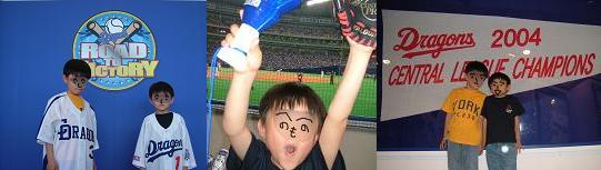 今シーズン4回目の名古屋ドームです。観に行った3試合は、2勝1敗ですが、点がナカナカ入らない・・・。最近は打線として繋がり始めているので、大量点で騒げる試合を期待しています。左:試合前、選手が実際着用したユニフォームでパチリ! チビ1は、立浪選手、チビ2は、福留選手のFANです。中:試合は、12:1で快勝、チビ2勝利の雄叫び! 久々にハラハラしない圧勝劇を楽しみました。右:早くも貯金が『10』、2位と4.5ゲーム差。 2005年のペナントもいただきます!次回は、5/15 ホークス戦を観にいく予定。日本シリーズの偵察(?)となる交流試合は、楽しみです。