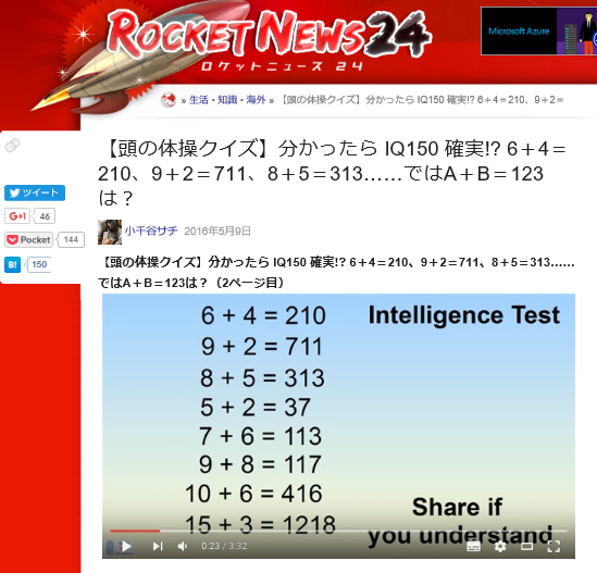 私が、マイクロソフトのニュースを見ていると、IQテストの問題が目にとまりました。 それは、次の様な記事でした。【頭の体操クイズ】分かったら IQ150 確実!? 6+4=210、9+2=711、8+5=313……ではA+B=123は? 私は、何となく気になり、クリックしてやってみました。 どうせ、無理だろうと思いながらも、やってみたのです。 こう言う数学、いや、算数に見えますが、こう言うものから、随分、遠ざかっていますので、何となく苦手意識があります。 でも、出来たのです。 自分でも、まさか、と思いましたが、解答のページに行ってみると、そこは、ロケットニュースのぺージでした。 そこには、次なる問題も用意されていて、正解は、1000人に一人と言う問題があり、それも出来ました。 私は、嬉ピ~と思いました。 自分のIQは、130位じゃないか、と思っていたからです。 あまり、大した知能指数では無いとは、思っていましたが、私は、昔、絵ばかり描いておりましたので、勉強には興味を持たなかったのです。 それでも、高校の時は、少しは勉強しなければと思い、理科系の特進にいましたが、今、IQの事を知ってみると、平均が105位で、130が結構、高い方に入るらしく、驚きました。■ アルバート アインシュタイン 缶バッチ それで、このテストを受けて、IQ150以上確実とか、付属の問題で、これが出来れば1000人に一人と言う問題なども出来ましたので、まさか、と思ったのです。 何と、これは、天才の領域に入る? らしいですね。 天才と言うのは、IQ180位かと思っていたのですが、そうじゃないらしいのです。 もし、父親が、学習塾などに行かせてくれていたら、私も東大へ行ったかも知れない? そんな風に思いましたが、後の祭りです。 でも、親戚などには、東大へ行った人もいますし、そこで教授をやっていた人もおります。 まんざら、悪い家系でも無いとは思っておりましたが、もっと早く、自分のIQを知っていれば・・・。 ところで、これは、ロケットニュースからの転載らしく。 答え合わせに、そのページに行った時、何でも書けるライター募集の記事がありました。 私は、なるほど、と思いました。 このIQの記事の、本当の目的は、ライターを募集する為のテストだったんだな、そう思ったしだいです。 そう、もし、あなたが、文章に興味があるならば、ライター募集に、応募してみるのもいいのではないかと思います。 ギャラがいくら出るか分かりませんが、小遣い稼ぎになるかも知れません。 ■ Can You Solve This Intelligence Test? Viral Facebook Puzzle これが、大元の問題らしいです。 解答が知りたい人は、この動画か、ロケットニュースのリンクを見て下さい。■ アインシュタインの宇宙 最新宇宙学と謎の「宇宙項」 角川ソフィア文庫 / 佐藤勝彦 サトウカツ…